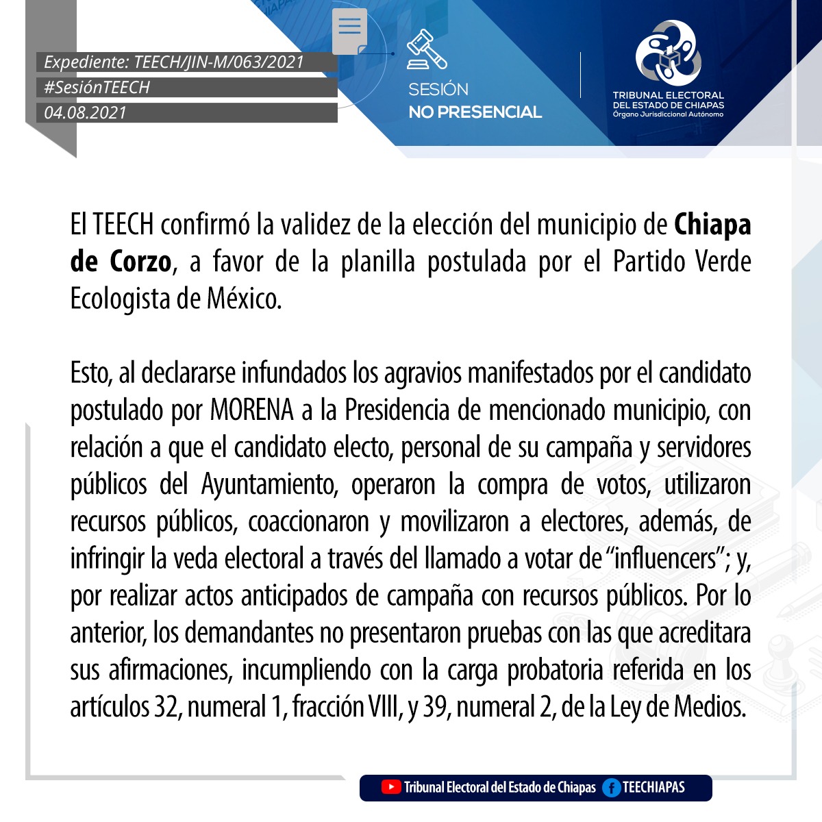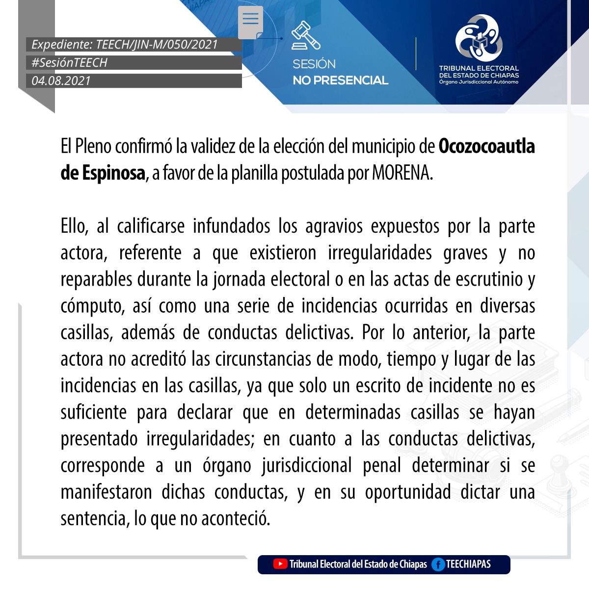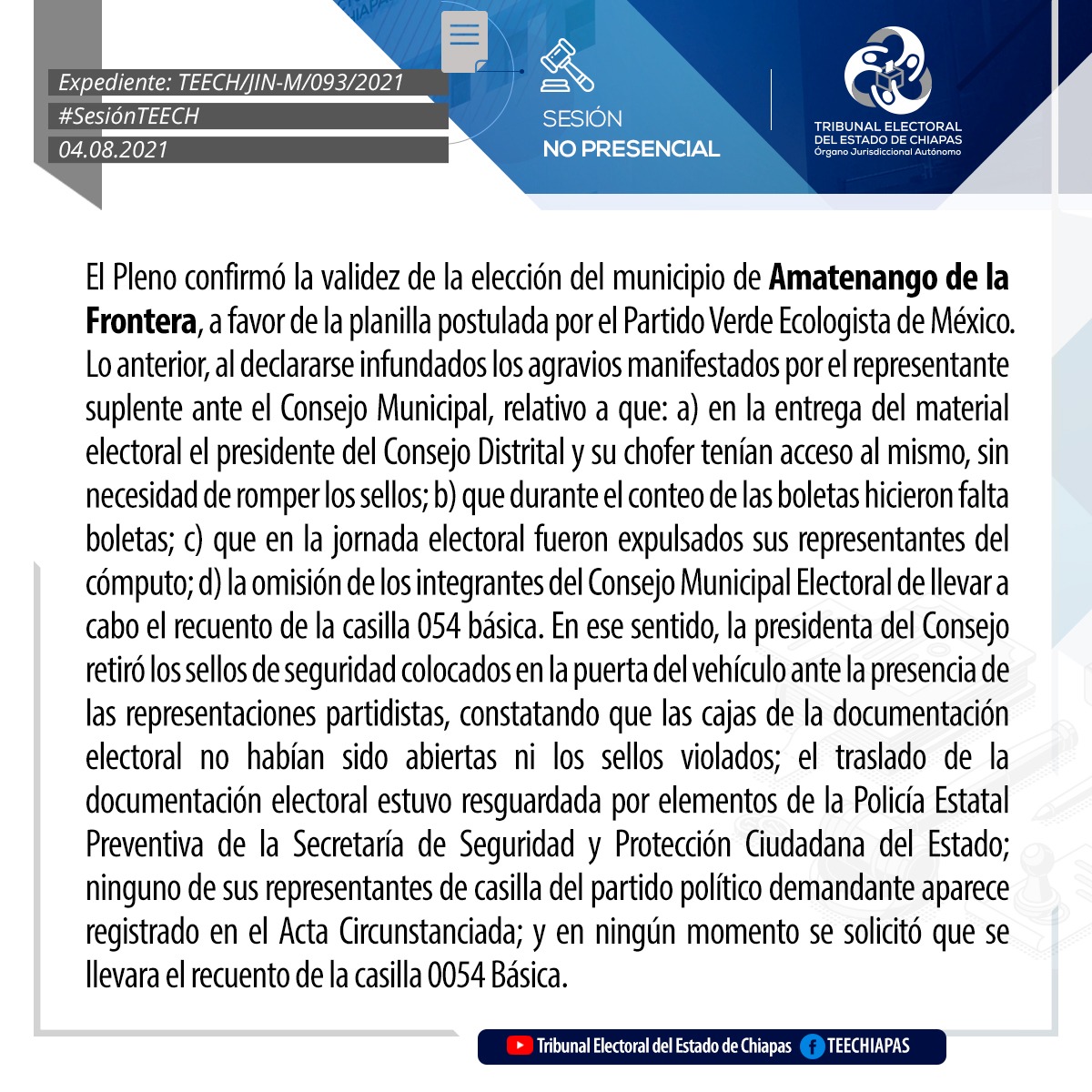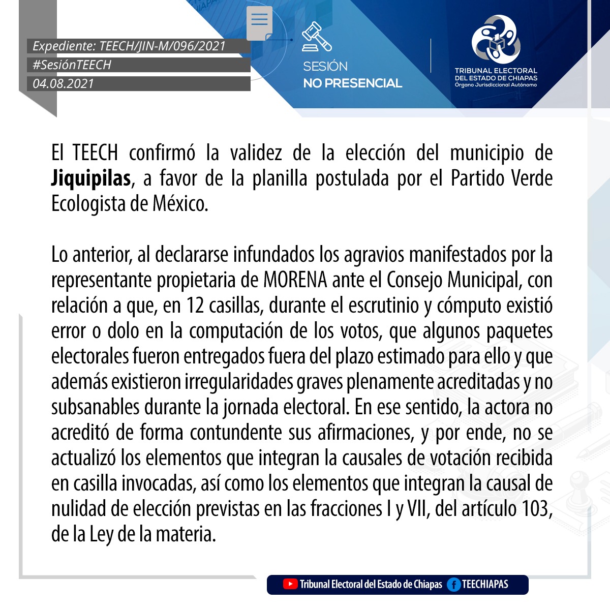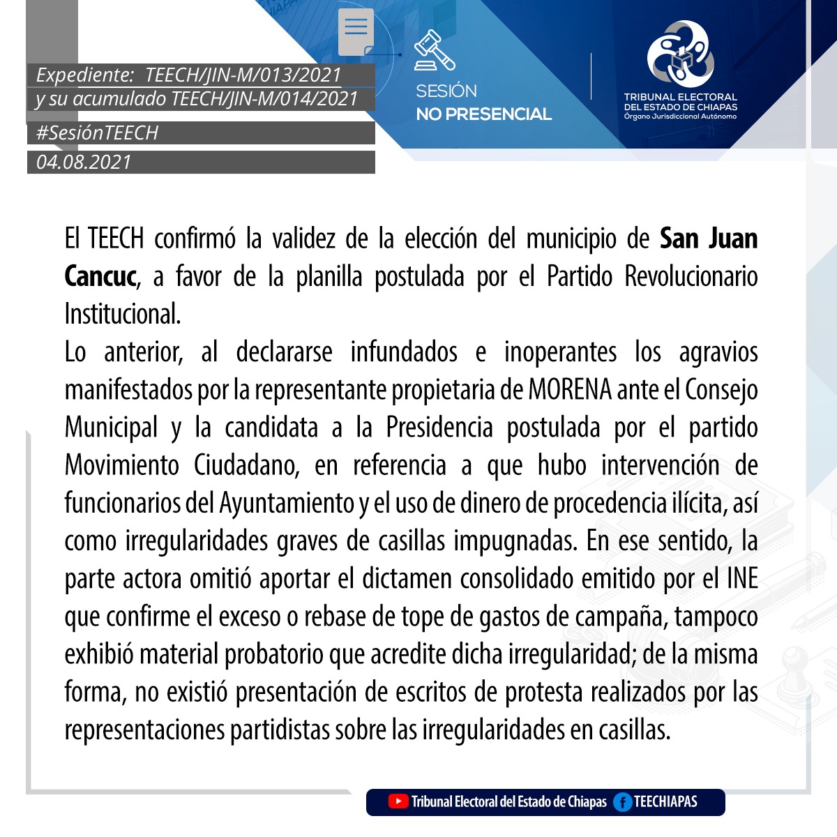 Tuxtla Gutiérrez, Chiapas, 04 de Agosto de 2021.En sesión pública no presencial, mediante videoconferencia, el Pleno del Tribunal Electoral del Estado de Chiapas (TEECH), confirmó la validez de las elecciones, así como la entrega de constancias de mayoría y validez a las planillas ganadoras de los municipios de San Juan Cancuc, Ocozocoautla, Chiapa de Corzo, Mezcalapa, Amatenango de la Frontera, Jiquipilas y Bella Vista.