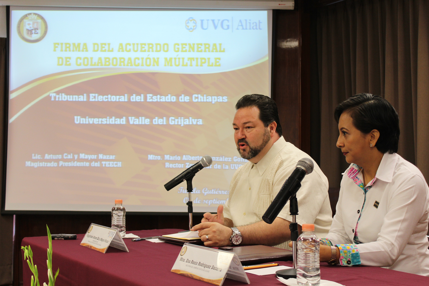 Tuxtla Gutiérrez, Chiapas.- 08 de septiembre de 2016.- El Tribunal Electoral del Estado de Chiapas (TEECH) en coordinación con el Centro de Formación Electoral, firmaron convenio de colaboración con la Universidad Valle del Grijalva (UVG) para trabajar de manera conjunta en el diseño de programas enfocados en el fortalecimiento de la educación cívica y la práctica de los valores democráticos.