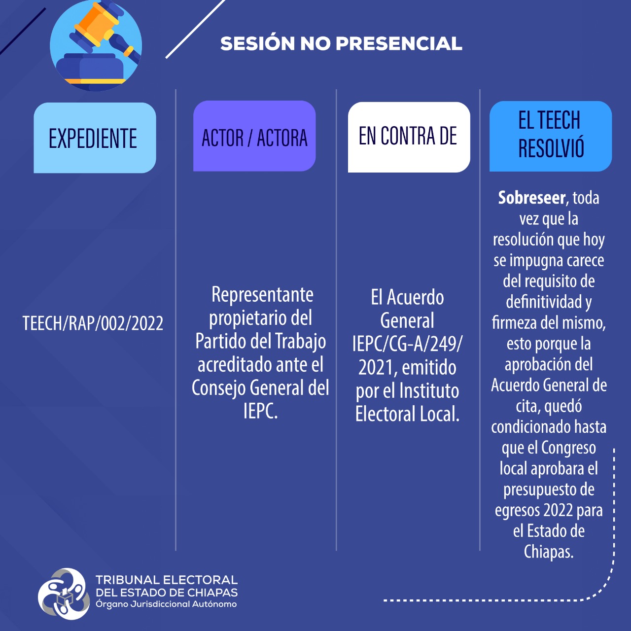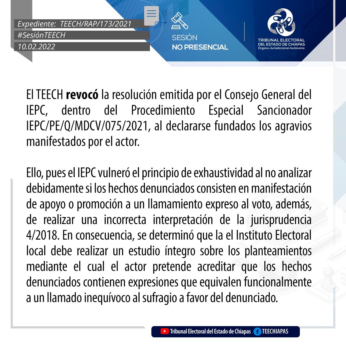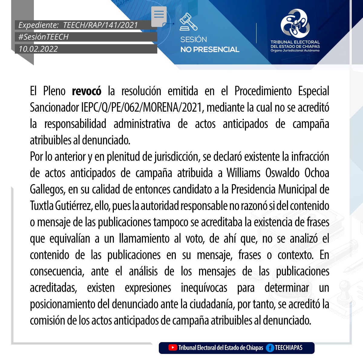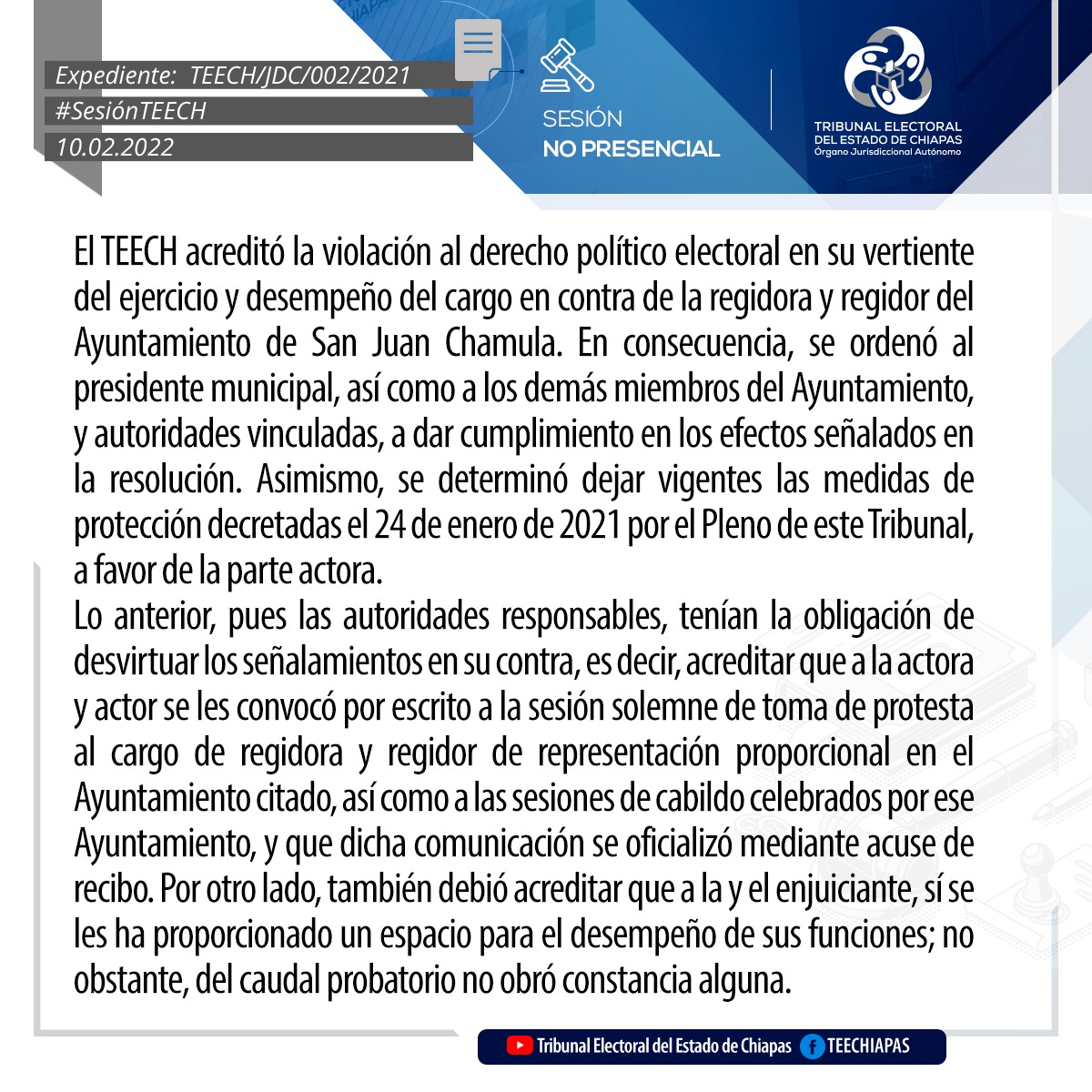 Tuxtla Gutiérrez, Chiapas, 10 de febrero de 2022.- Por unanimidad de votos, el Pleno del Tribunal Electoral del Estado de Chiapas (TEECH) modificó el acuerdo IEPC/CGA-253/2021, emitido por el Consejo General del Instituto de Elecciones y Participación Ciudadana, por el que determinó declarar inconcluso e incompleto el proceso electivo por usos y costumbres de integrantes de Ayuntamiento del Municipio de Oxchuc para el periodo 2022-2024.