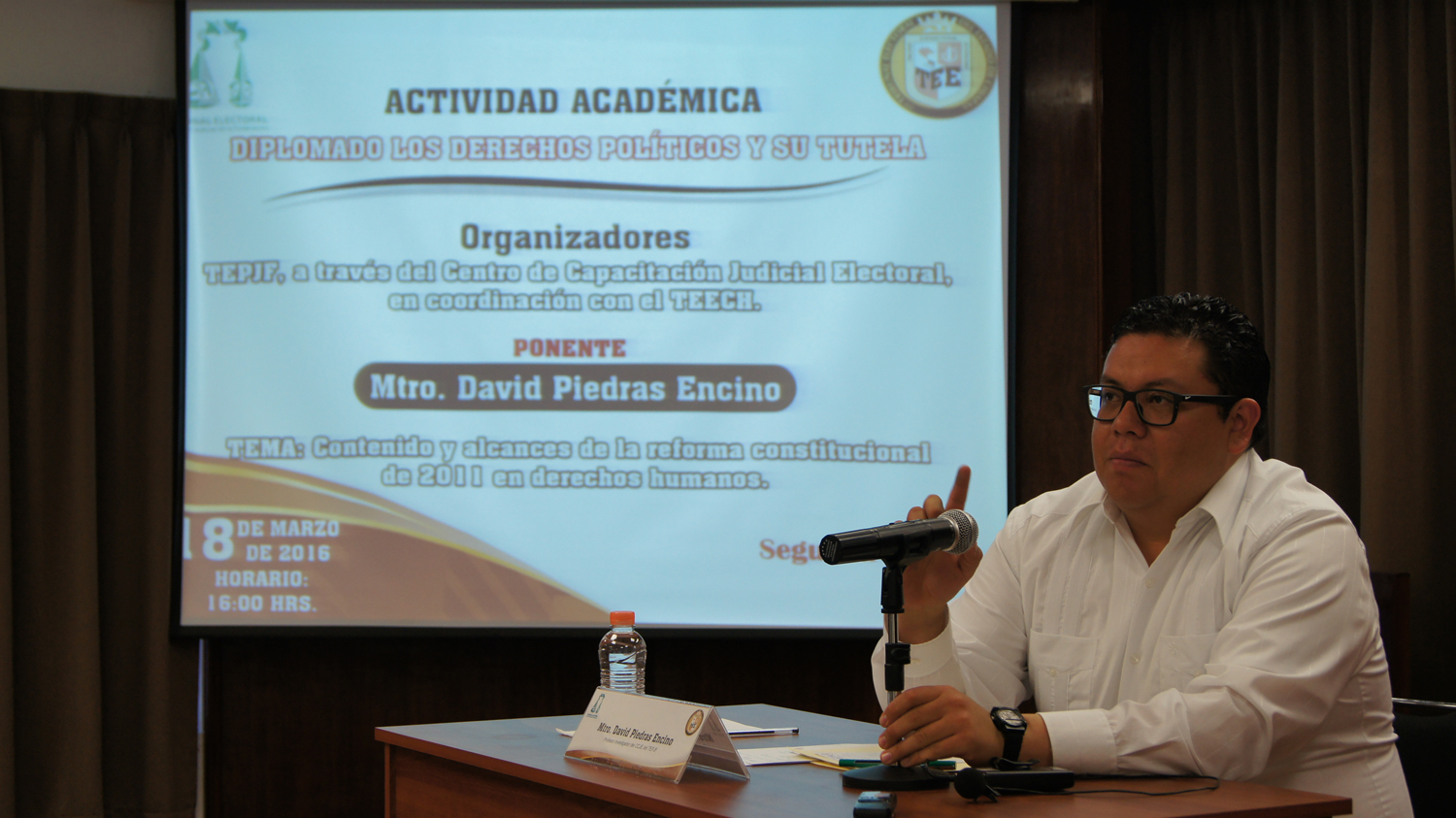 Tuxtla Gutiérrez, Chiapas, 18 de marzo de 2016.- Con la partición del doctor David Piedras Encino con el tema “Contenido y alcance de la reforma constitucional de 2011 en derechos humanos”, se continúa la capacitación para el personal jurisdiccional del Tribunal Electoral del Estado de Chiapas (TEECH) en el marco del diplomado “Los derechos políticos y su tutela”, organizado por el Centro de Formación Electoral en coordinación con el Centro de Capacitación Judicial Electoral del Tribunal Electoral del Poder Judicial de la Federación (TEPJF).