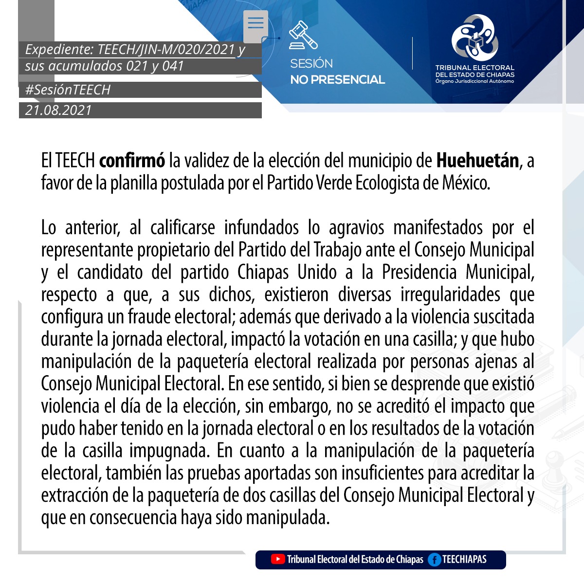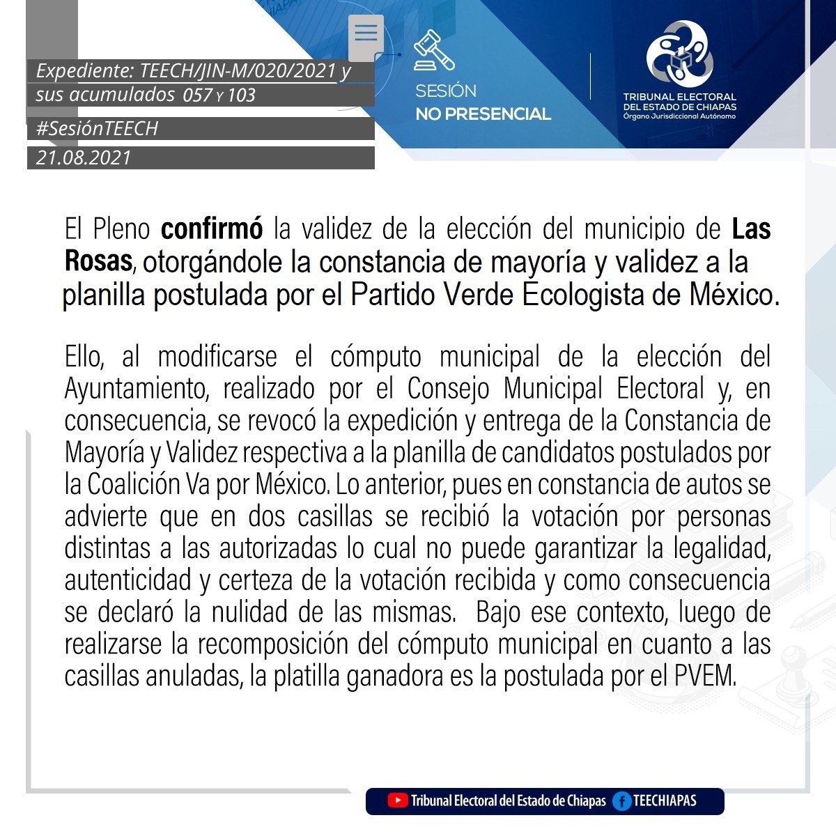 Tuxtla Gutiérrez, Chiapas, 21 de Agosto de 2021.En sesión pública no presencial, el Pleno del Tribunal Electoral del Estado de Chiapas (TEECH) confirmó la validez de las elecciones, así como la entrega de constancias de mayoría y validez a las planillas ganadoras de los municipios de Tuxtla Gutiérrez, Las Rosas, Mitontic, Villaflores, Huehuetán y Las Margaritas.