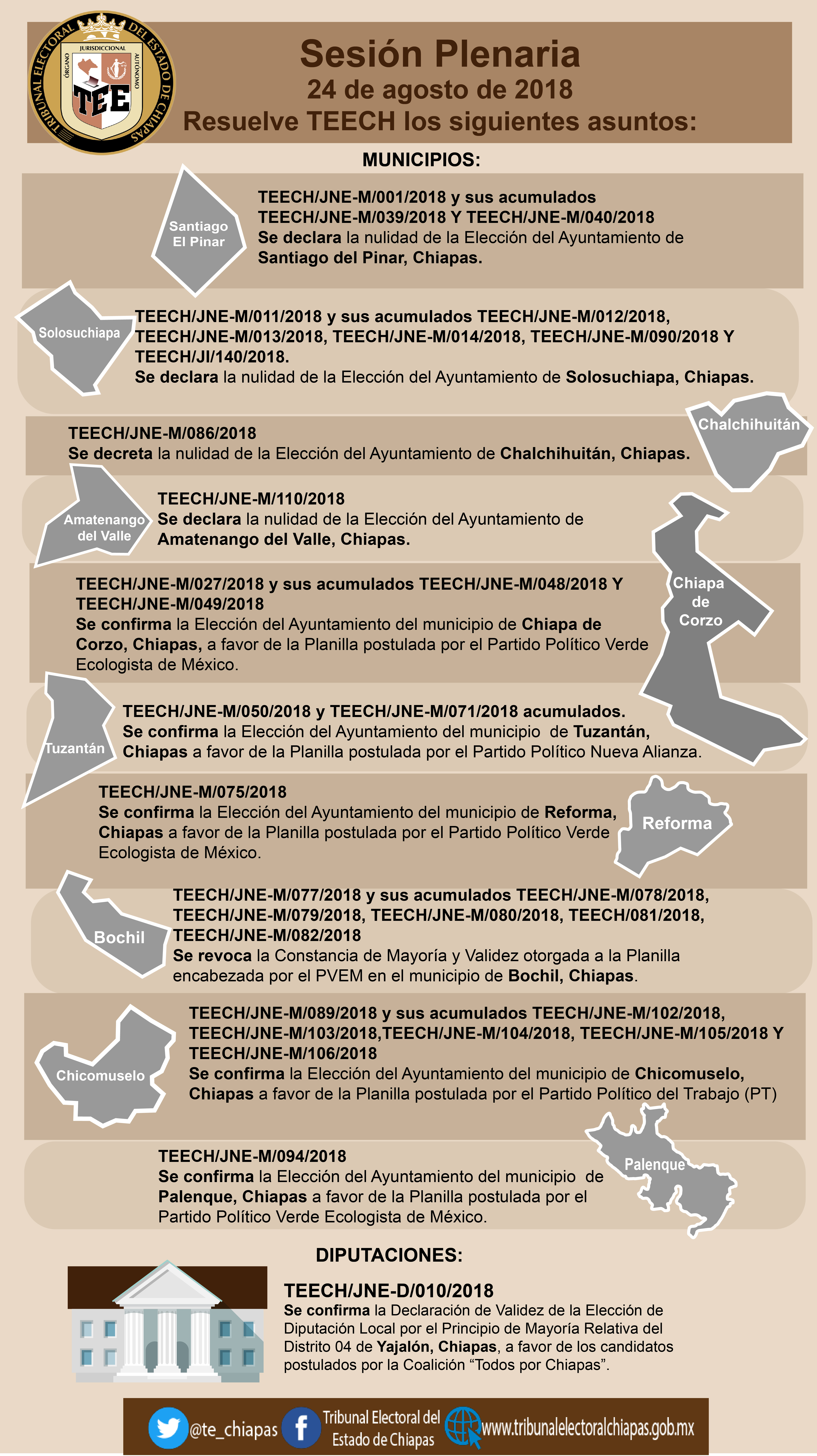 Tuxtla Gutiérrez, Chiapas, 24 de agosto de 2018.- El Pleno del Tribunal Electoral del Estado de Chiapas (TEECH), en sesión pública, discutió los proyectos de resolución correspondiente a los siguientes medios de impugnación: