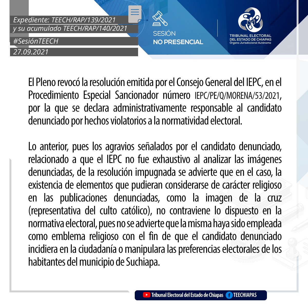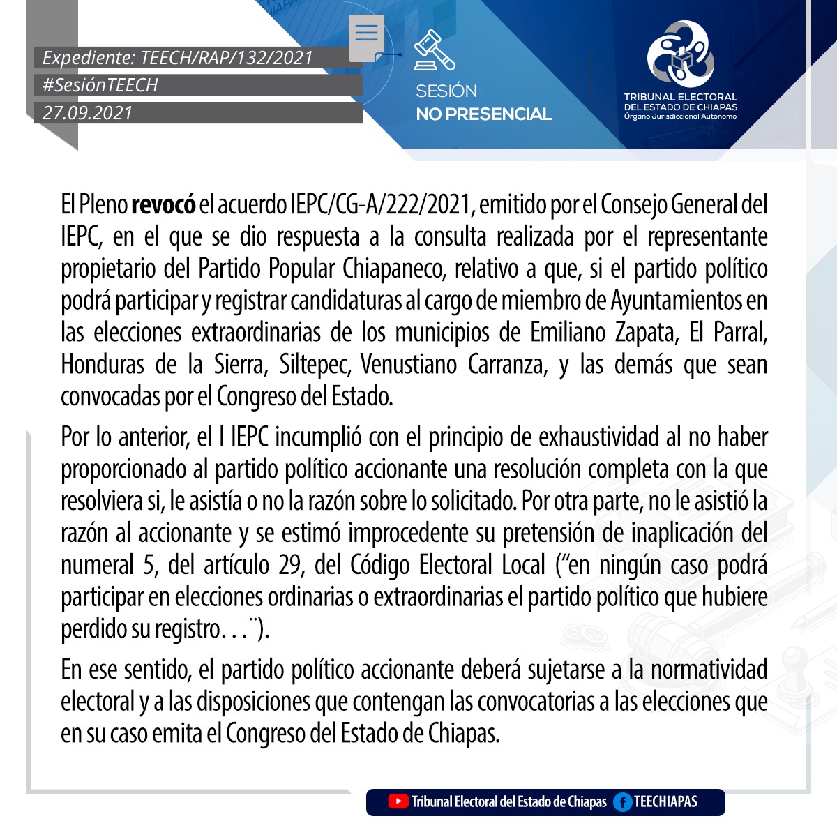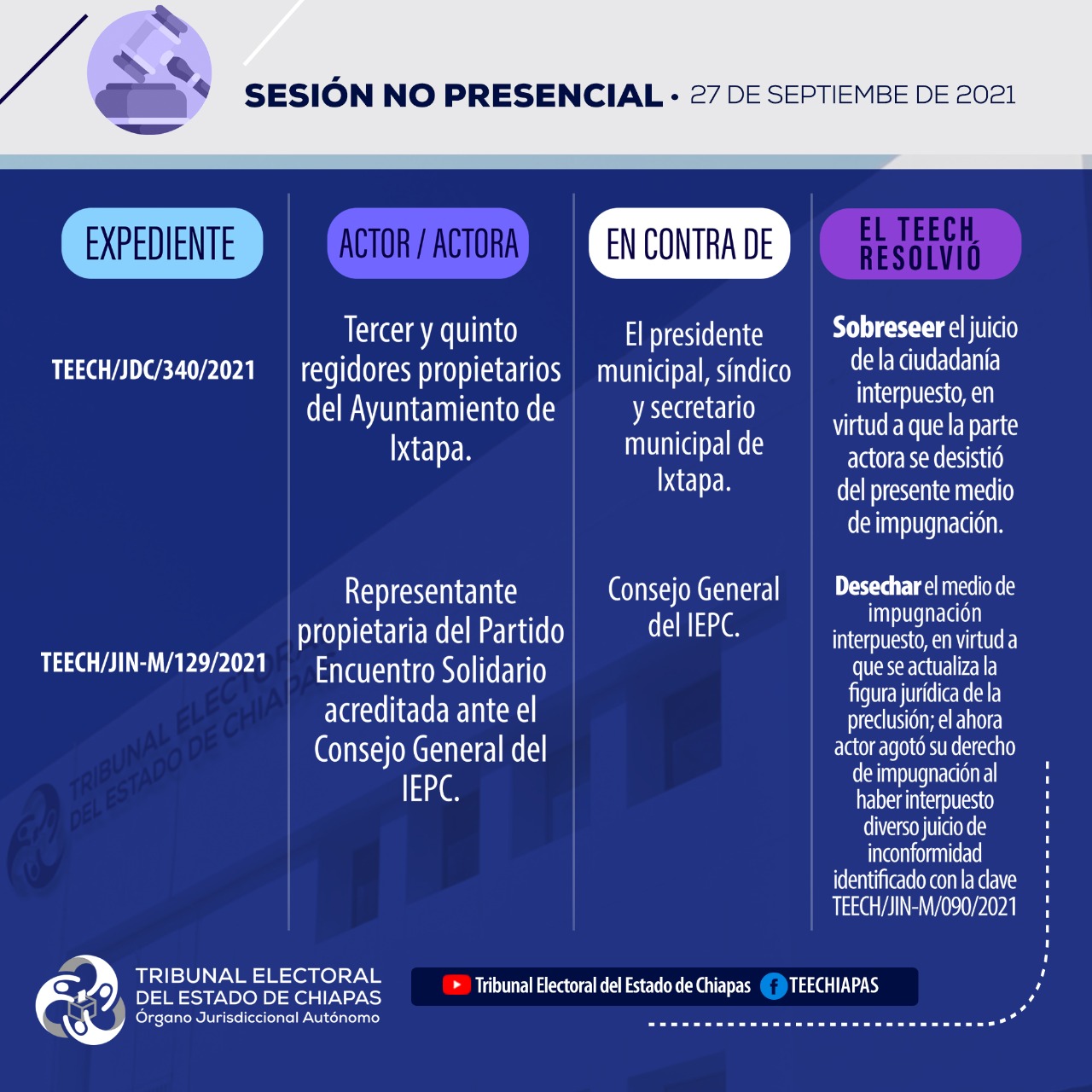 Tuxtla Gutiérrez, Chiapas, 27 de septiembre de 2021.En sesión pública no presencial, mediante videoconferencia, el Pleno del Tribunal Electoral del Estado de Chiapas (TEECH), asignaron las regidurías por el principio de representación proporcional en los Ayuntamientos de Ocotepec, Solosuchiapa, Tapalapa.