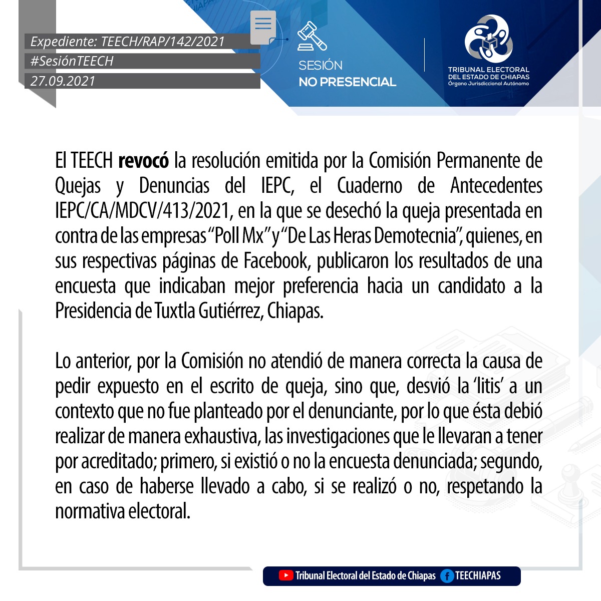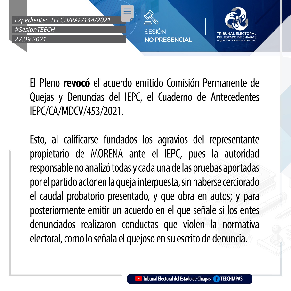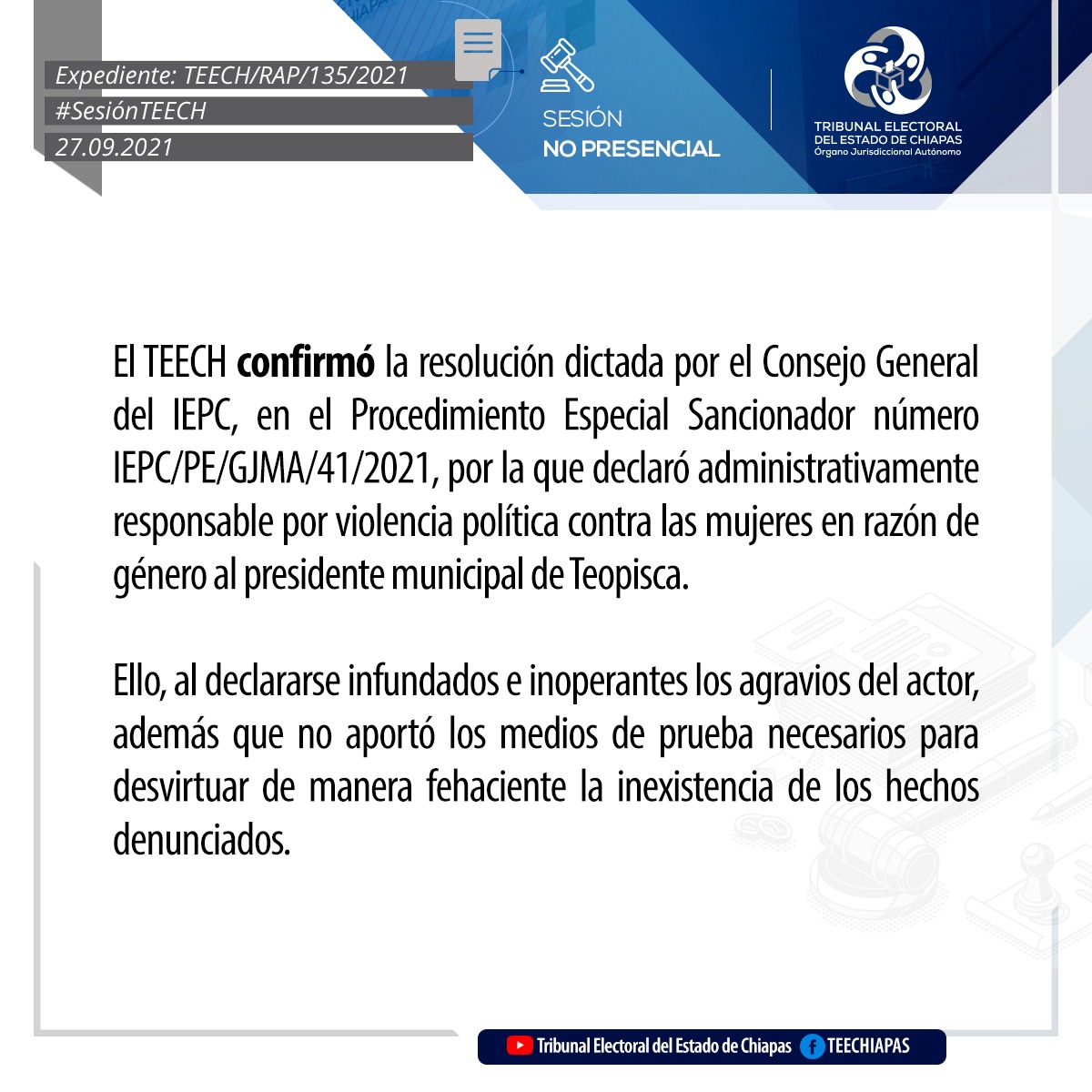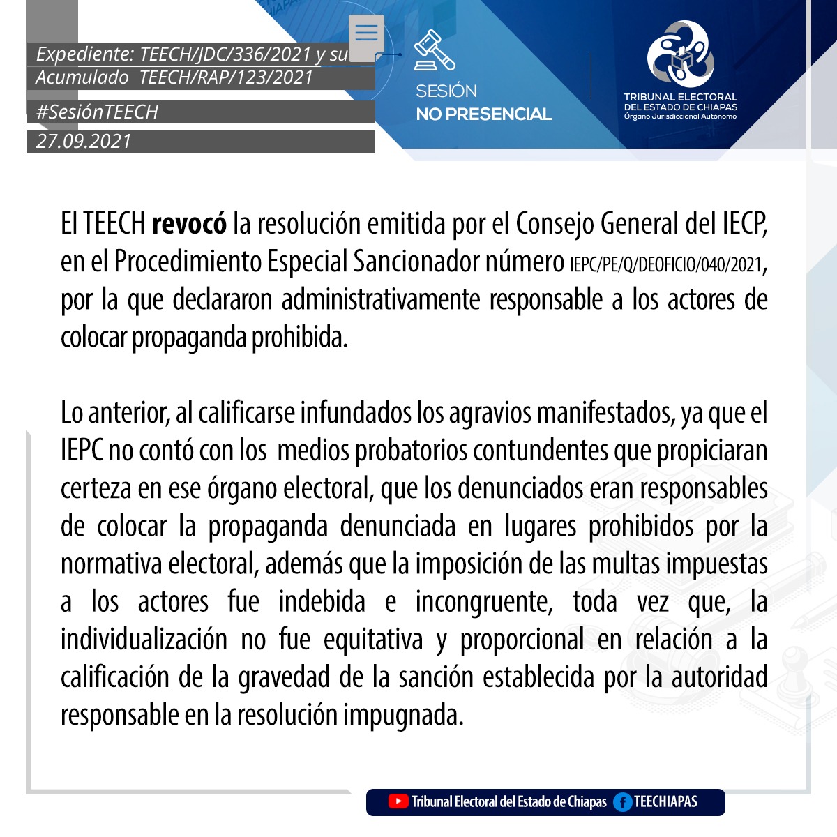 Tuxtla Gutiérrez, Chiapas, 27 de septiembre de 2021.En sesión pública no presencial, mediante videoconferencia, el Pleno del Tribunal Electoral del Estado de Chiapas (TEECH), asignaron las regidurías por el principio de representación proporcional en los Ayuntamientos de Ocotepec, Solosuchiapa, Tapalapa.