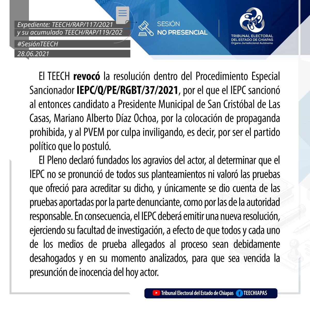 Tuxtla Gutiérrez, Chiapas, 28 de junio de 2021.En sesión pública mediante videoconferencia, el Pleno del Tribunal Electoral del Estado de Chiapas (TEECH) ordenó a la Comisión Nacional de Justicia Partidaria del PRI, desahogue probanzas en contra del expresidente del Comité Directivo Estatal del PRI, Julián Nazar Morales, por supuesto desvío de recursos destinados al Organismo Nacional de Mujeres Priístas del Estado de Chiapas, asimismo, se modifique la sanción en relación a los actos acreditados de violencia política en razón de género.