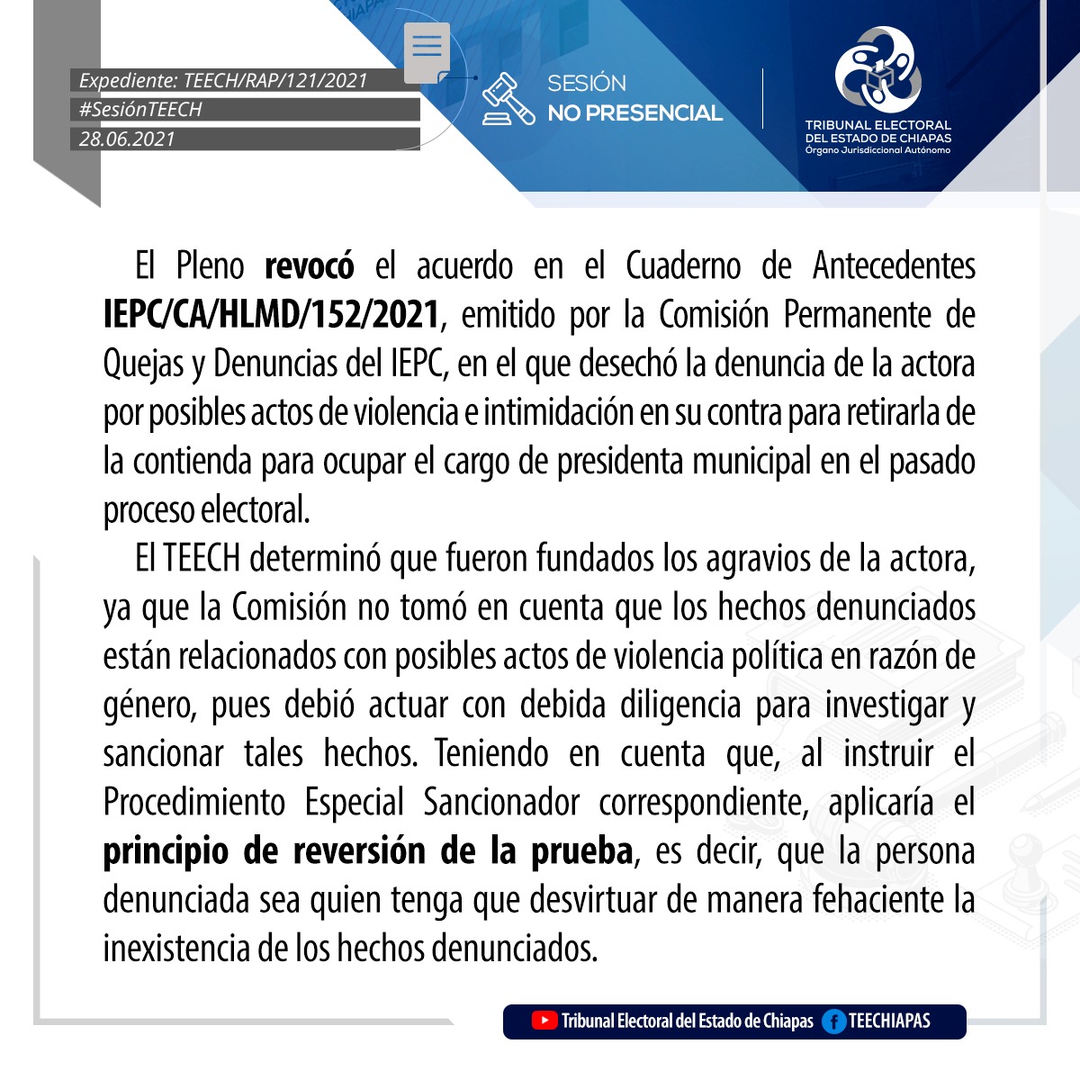 En el expediente TEECH/JDC/330/2021, promovido Ruth Aurelia Pensamiento Morales, en calidad de militante del Revolucionario Institucional, el TEECH revocó la resolución CNJP-PS-CHP-067/2020, emitida por la mencionada Comisión, en ese sentido, se dejó insubsistente la amonestación pública impuesta al denunciado.